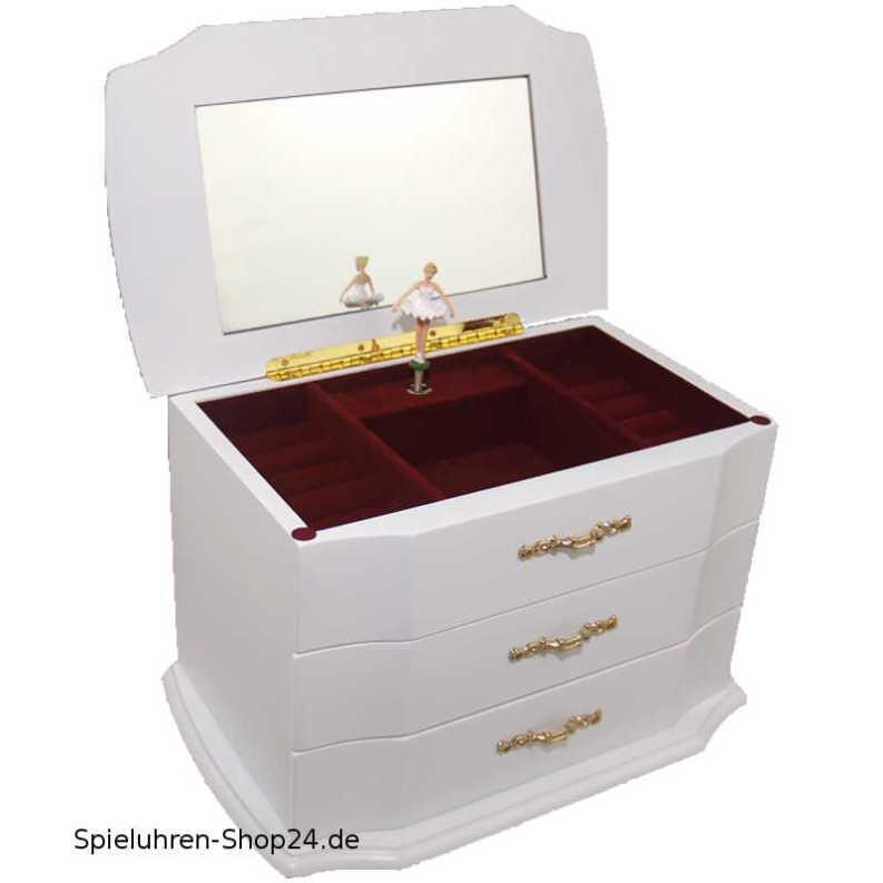 Wird der Deckel geöffnet, präsentieren sich mit dunkelrotem Samt ausgekleidet je an den Seiten ein Ringfach und mittig ein Schmuckfach. Hierin dreht sich eine Tänzerin schwungvoll nach dem Klavier-Stück "Für Elise" . Während des Tanzes spiegelt sich die Ballerina im Glasspiegel, der im Inneren des Deckels der erwachsenen-Spieluhr haftet. Mit dem Schließen des Deckels legt sich die Ballerina mittels einer Feder wieder zurück in die Holzschmuckkommode.