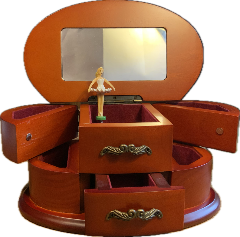 Diese exquisite Schmuckschatulle aus mahagonifarbenem Holz besticht durch ihre ovale Form und die edle Verarbeitung. Beim Öffnen des Deckels beginnt eine anmutige Ballerina, sich zur Melodie "Bolero" von Maurice Ravel zu drehen. Das Innere der Schatulle ist mit dunkelrotem Samt ausgekleidet und bietet mehrere Fächer für Ihre wertvollen Schmuckstücke. Zwei seitliche, halbrunde Fächer lassen sich raffiniert wegklappen und werden beim Schließen sanft von Magneten gehalten. Eine zusätzliche Schublade bietet weiteren Stauraum für Ihre Kostbarkeiten. Ein eingelassener Glasspiegel im Deckel reflektiert die tanzende Ballerina und verstärkt die zauberhafte Atmosphäre.