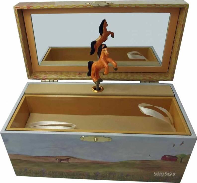 Im Inneren der Kinder - Spieluhr dreht sich ein braunes Pferd zur Melodie "My old Kentucky home", einem Cowboy-Lied. Eine biegsame Für Ketten oder andere Kostbarkeiten ist das große Fach in der Kinder - Spieluhr ein wunderbarer Platz.