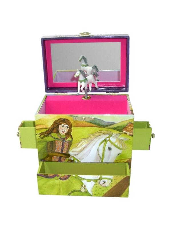 Zu verschiedenen Melodien dreht sich das weiße Pferd. Eine biegsame Feder lässt beim Schließen die Figur unbeschadet in der