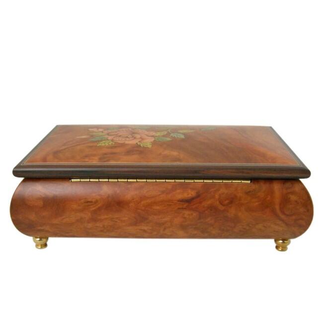 Mattes Holz mit zauberhafter dunkel umrahmter Instrumenten- und Blumen-Intarsien auf feinen, goldfarbenen Füßchen, so zeigt sich Ihnen eine geschmackvolle Musikdose mit einem Schmuckfach inklusive Ringhalter in champagnerfarbenem Samt. Daneben liegt das goldfarbene Musikwerk unter der abnehmbaren Samtabdeckung, wodurch Sie dem Spielwerk zuschauen können.